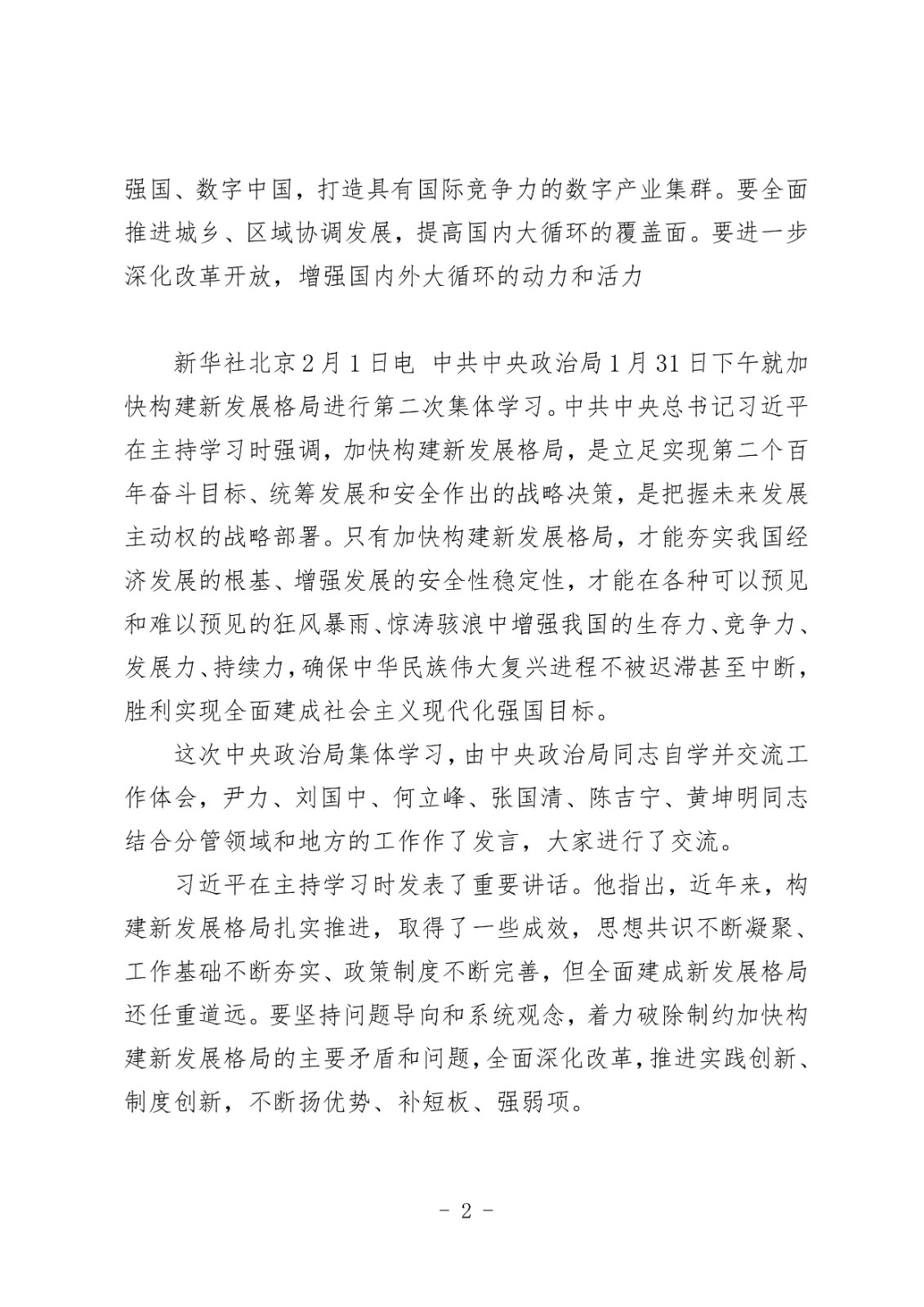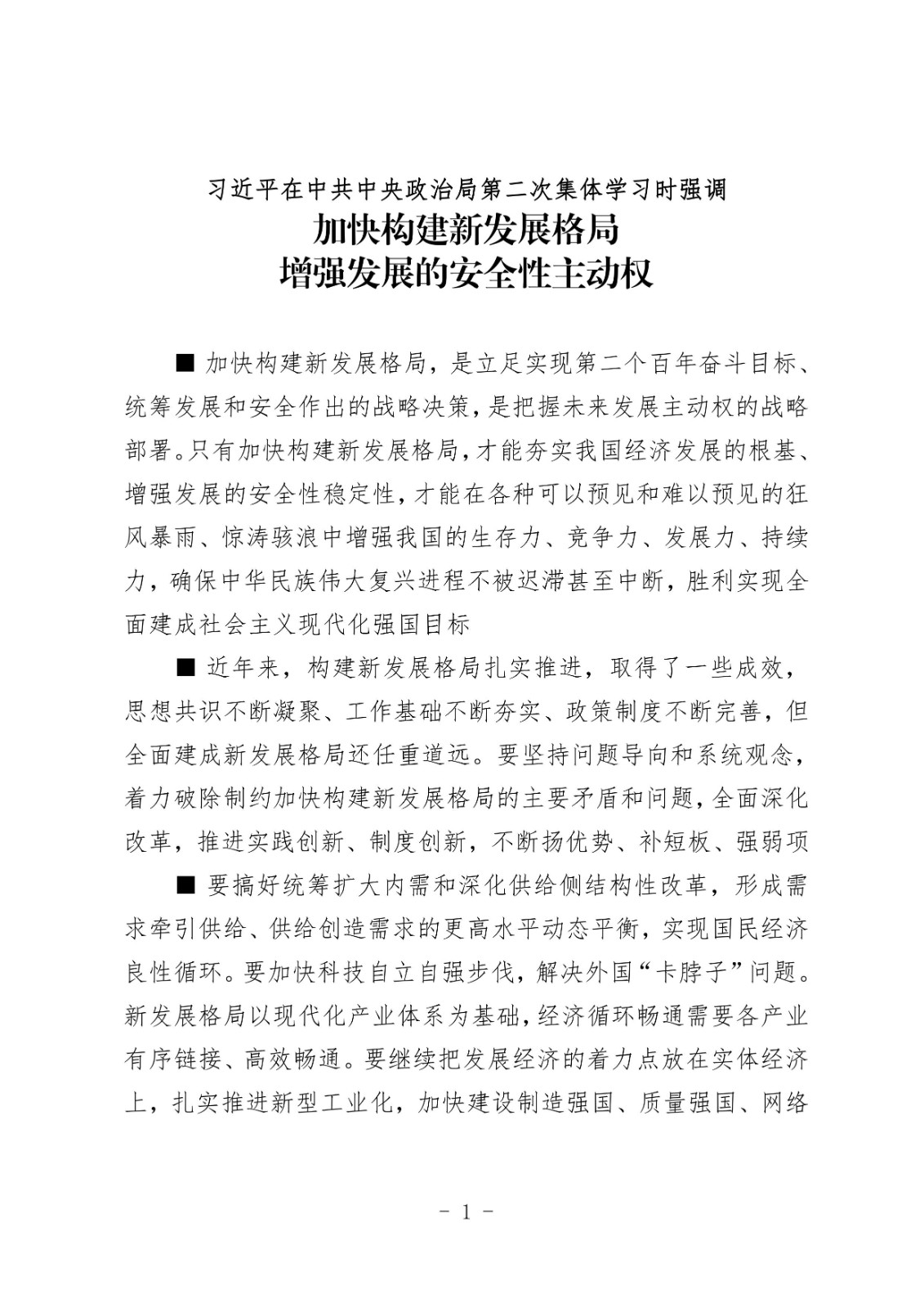 習(xí)近平在中共中央政治局第二次集體學(xué)習(xí)時強(qiáng)調(diào)加快構(gòu)建新發(fā)展格局 增強(qiáng)發(fā)展的安全性主動權(quán)